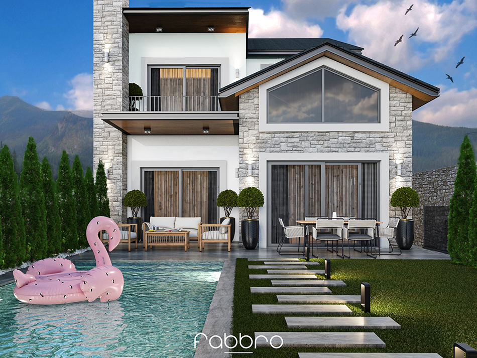 Bu villa projesi, lüks ve konforu bir araya getirirken aynı zamanda doğanın sunduğu huzuru modern yaşamın olanaklarıyla bütünleştiriyor. Projede kullanılan taş dokular, iç mekanlarda sıcak ve doğal bir atmosfer oluşturuyor. Galeri boşluklu salon alanı, ferahlık hissini artırarak geniş ve açık bir yaşam alanı sunuyor. Tavanlarda yer alan ahşap paneller, mekana zarif ve sofistike bir dokunuş katarken, estetik bir görüntü sağlıyor. Geniş pencereler, iç mekanların doğal ışıkla dolmasını sağlarken dışarıdaki büyüleyici vadi manzarasını da sürekli olarak gözler önüne seriyor. Özellikle kış aylarında odun şöminesi, yaşam alanlarına sıcak ve davetkar bir ortam sunarak konforu artırıyor. Şık yemek alanı, sosyal etkinlikler ve aile yemekleri için ideal bir ortam yaratırken, fonksiyonel mutfak ve ada mutfak tasarımı, yemek yapmayı keyifli bir deneyime dönüştürüyor. Banyoların geniş pencereleri, gün ışığını içeri alarak ferahlık hissini pekiştiriyor. Merdiven altındaki iç bahçe, eve doğal bir yeşillik ve tazelik katarken, sakinlerine huzur dolu bir yaşam sunmayı hedefliyor. Bu villa, her detayıyla sakinlerine lüks ve konfor dolu bir yaşam deneyimi vaat ediyor.