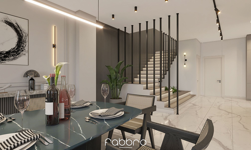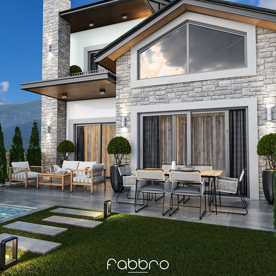 Bu villa projesi, lüks ve konforu bir araya getirirken aynı zamanda doğanın sunduğu huzuru modern yaşamın olanaklarıyla bütünleştiriyor. Projede kullanılan taş dokular, iç mekanlarda sıcak ve doğal bir atmosfer oluşturuyor. Galeri boşluklu salon alanı, ferahlık hissini artırarak geniş ve açık bir yaşam alanı sunuyor. Tavanlarda yer alan ahşap paneller, mekana zarif ve sofistike bir dokunuş katarken, estetik bir görüntü sağlıyor. Geniş pencereler, iç mekanların doğal ışıkla dolmasını sağlarken dışarıdaki büyüleyici vadi manzarasını da sürekli olarak gözler önüne seriyor. Özellikle kış aylarında odun şöminesi, yaşam alanlarına sıcak ve davetkar bir ortam sunarak konforu artırıyor. Şık yemek alanı, sosyal etkinlikler ve aile yemekleri için ideal bir ortam yaratırken, fonksiyonel mutfak ve ada mutfak tasarımı, yemek yapmayı keyifli bir deneyime dönüştürüyor. Banyoların geniş pencereleri, gün ışığını içeri alarak ferahlık hissini pekiştiriyor. Merdiven altındaki iç bahçe, eve doğal bir yeşillik ve tazelik katarken, sakinlerine huzur dolu bir yaşam sunmayı hedefliyor. Bu villa, her detayıyla sakinlerine lüks ve konfor dolu bir yaşam deneyimi vaat ediyor.